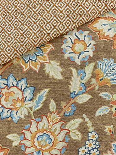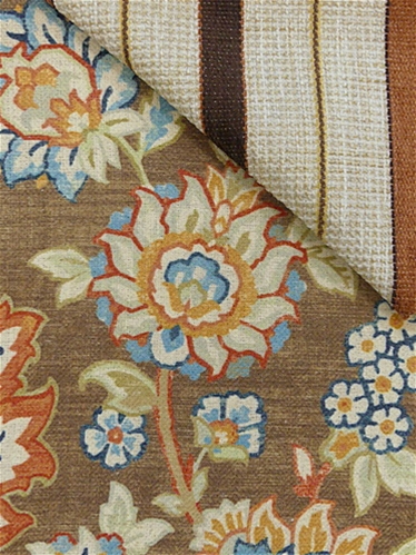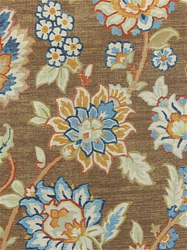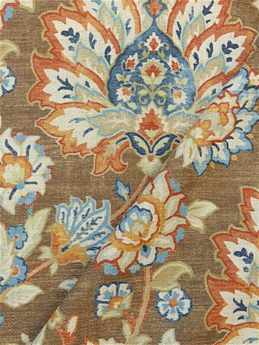 Diva 603 Chocolate by Covington Fabric is a high-performance linen blend fabric featuring a sarouk rug array of floral patterns, featuring a medallion design in the center, surrounded by floral motifs and intricate vine scrolls. Diva 603 Chocolate showcases rich tones of terracotta, tonal blues, taupe, white, golden yellow, and beige, all set against a brown variegated background. The natural texture of linen is enhanced by its sturdy construction, making it an ideal choice for those looking for both beauty and functionality. This fabric combines the timeless appeal of linen with the resilience needed for heavy-duty use, ensuring long-lasting quality.