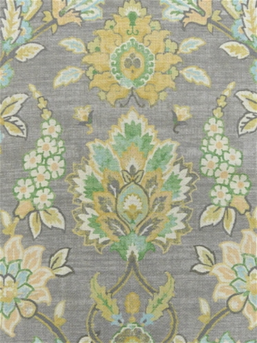 Diva 908 Platinum by Covington Fabric is a high-performance linen blend fabric featuring a sarouk rug array of floral patterns, featuring a medallion design in the center, surrounded by floral motifs and intricate vine scrolls. Diva 908 Platinum showcases rich tones of tan, sage green, aqua blue, off white, dark grey and petal pink, all set against a grey variegated background. The natural texture of linen is enhanced by its sturdy construction, making it an ideal choice for those looking for both beauty and functionality. This fabric combines the timeless appeal of linen with the resilience needed for heavy-duty use, ensuring long-lasting quality.