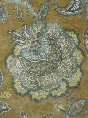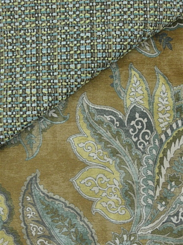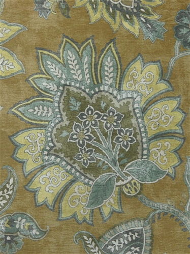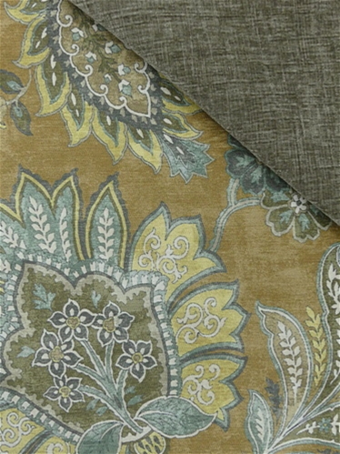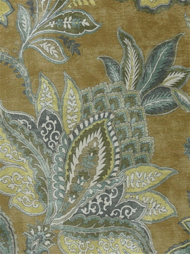 Fornax 820 Empire Gold by Covington Fabric isn’t your run-of-the-mill fabric—it’s the velvet-soft superhero of the textile world. Imagine a chic, velvety hand that invites you to snuggle up, but don’t let that fool you into thinking it’s delicate. This printed chenille is tough as nails, with a Jacobean floral pattern so bold it practically shouts sophistication. The color palette is like a painter's dream: old gold, white, brown, soft aqua, spa blue, slate grey swirled together on a marbled pale brown backdrop. It’s the kind of fabric that makes your couch feel like a throne, and your throw pillows feel like you’ve discovered the secret to eternal elegance.