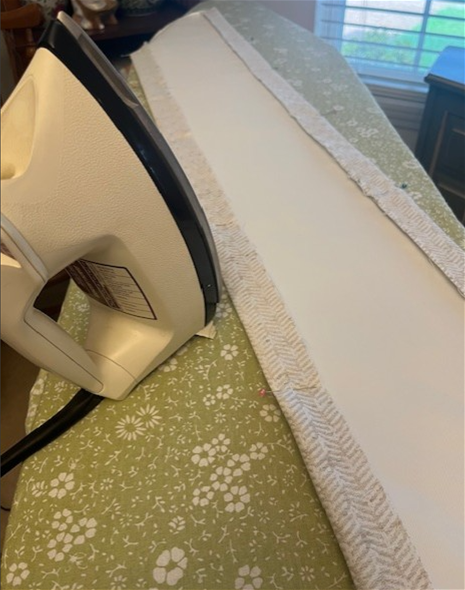 Sew down along that edge. Adjust the fabric to ensure the lining fabric is centered. Pin it to keep it centered, making sure not to pin into any of the drapery lining fabric. I then ironed these edges so they would have a crisp edge.