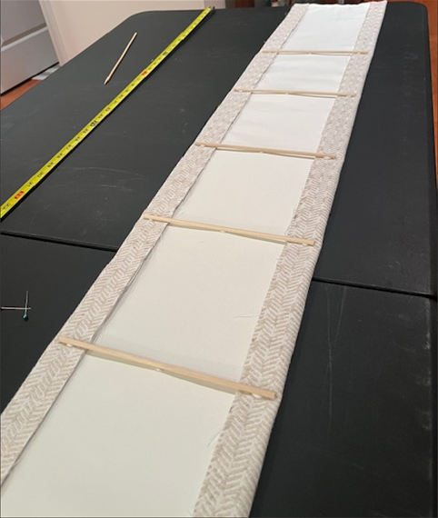 Once the Gem-Tac© dried for 24 hours, I turned the "pillow case" right-side out, carefully grabbing each dowel as I moved them with the fabric. Because my sidelight windows are thin and long, as well as the fact that I selected a thicker decorator fabric and blackout lining, this was very challenging. I had to go slow and carefully so that I didn't break the dowels. Honestly, this was the most difficult part of this project.
