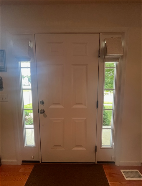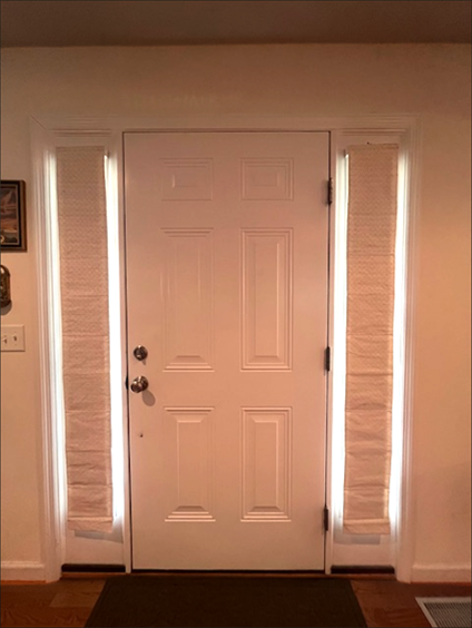 I cleaned and dried the wall above the sidelights. I measured and applied the loop side of the heavy duty Velcro© above the sidelights. I measured and stapled the hook side of the heavy duty Velcro© on the back side of the header (remember from above, the back side is the side that would be facing the wall). I put the curtain on the header and voila! It held up my Roman Shades which actually work and look pretty good! Whoop! Whoop!