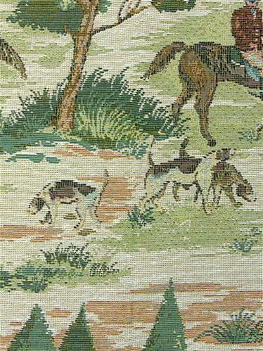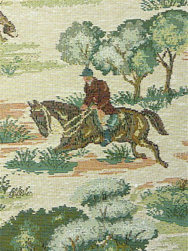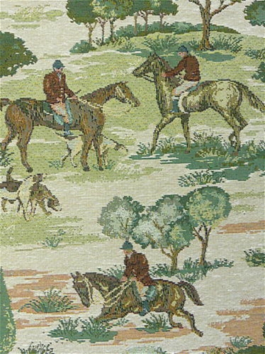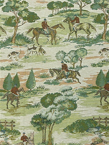 Hunting Meadow by Hamilton Fabric is a tapestry‑weight delight that brings together tonal greens, soft sienna, rusty red, off‑white, browns, and gentle pale blues in a woodsy scene that almost smells like pine (but without the sap). Woven with enough heft to hold up under daily use yet with a supple drape that whispers “sit back and admire me,” it features horses, hounds, trees, and hunters in a Hunting Meadow style that’s far from dull—playful in its imagery, serious in its craftsmanship.