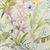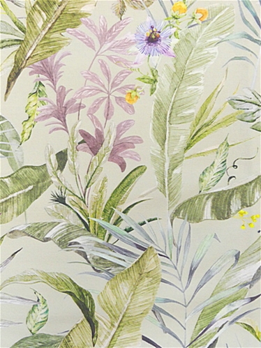 A beautiful foliage pattern displaying canary yellow and mulberry flowers with olive green leaves set on a light grey background.