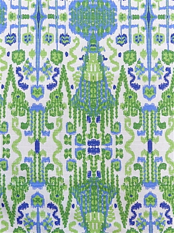 Bombay Kelly Cotton is a green and blue Ikat block print on a white cotton background from Lacefield Designs. Bombay Kelly is a multipurpose fabric perfect for curtains, duvet covers, pillows or light use upholstery.