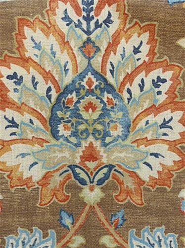 Diva 603 Chocolate by Covington Fabric is a high-performance linen blend fabric featuring a sarouk rug array of floral patterns, featuring a medallion design in the center, surrounded by floral motifs and intricate vine scrolls. Diva 603 Chocolate showcases rich tones of terracotta, tonal blues, taupe, white, golden yellow, and beige, all set against a brown variegated background. The natural texture of linen is enhanced by its sturdy construction, making it an ideal choice for those looking for both beauty and functionality. This fabric combines the timeless appeal of linen with the resilience needed for heavy-duty use, ensuring long-lasting quality.