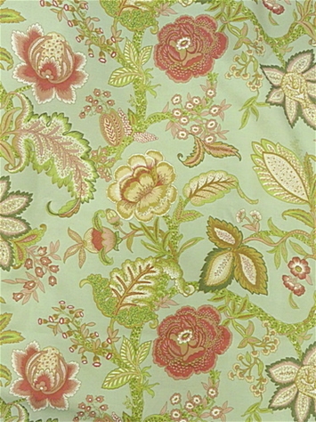 A rich green fabric accented with varying shades of pink and red flowers, layered with multi-toned green leaves for a vibrant, botanical look.You sai