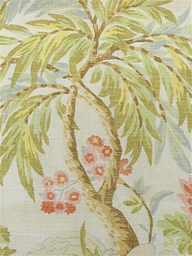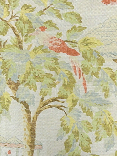 Forest & The Tree Apricot fabric by PK Lifestyles is a striking and sophisticated cotton blend toile, offering nature-inspired motifs. This large-scale print showcases beautiful landscape scenes, featuring trees with sage green, spa blue, pale yellow and mint green, leaves, and exotic herons with pale mint green and soft rose-colored feathers. All of this is set against a natural linen-colored background that provides a soft, neutral base to the vibrant colors and intricate detailing.