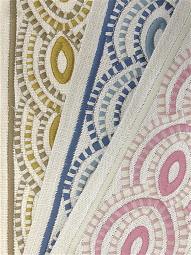 Fort-Alezas Arcors Slate Europatex Trim turns everyday edges into delightful design statements with brown and honey citron embroidery in playful geometric ovals on a natural background — the style punctuation mark every fabric needs. A standout from the Fort-Alezas Trim Collection, Arcors Slate brings just the right mix of modern charm and whimsical character, making each stitch feel like a tiny wink. With three color ways available, this trim invites you to mix, match, and marvel at how something so small can make such a big impression.