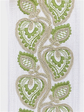 Fort‑Alezas Estense Elm Europatex Trim celebrates garden‑fresh elegance with embroidered deep lime green and tan vining leaves gracefully winding across a white background — a look that feels like springtime decided to moonlight in interior design. As part of the Fort‑Alezas Trim Collection, Estense Elm blends classic embroidery artistry with a touch of whimsical botanical charm, making this trim a delightful accent that brings personality to every project it graces. It’s the kind of detail that turns heads and starts conversations — especially among cushions.