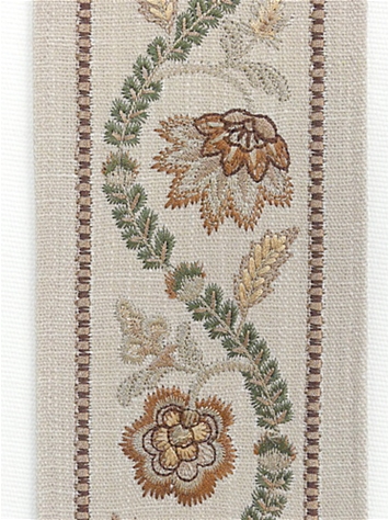 Fort-Alezas Torre Porcini Europatex Trim bursts with charm at first glance — a delightful floral-inspired embroidered trim with vibrant tan, olive green, brown, peach and taupe threads dancing across a soft taupe background like confetti at a garden party. Part of the Fort-Alezas Trim Collection, Torre Porcini feels like a bouquet you can sew, because it combines classic embroidery artistry with just enough pizzazz to make even plain fabrics do a double-take. This is decorative trim with personality — a little bold, a little refined, and all heart.